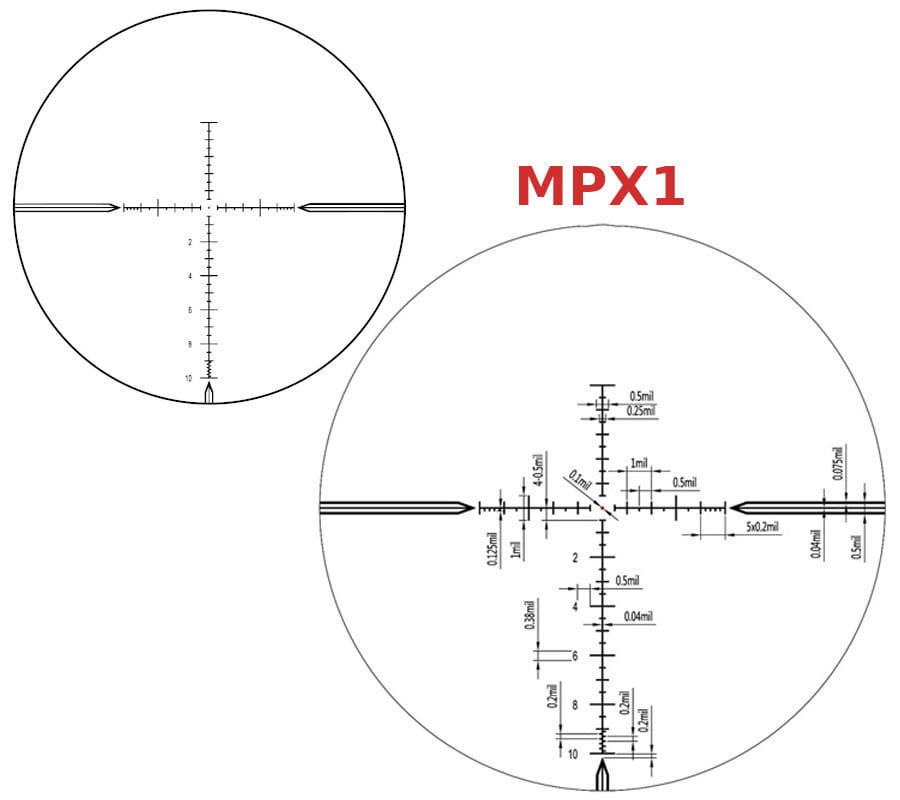 • Siatka celownicza: krzyż balistyczny typu MPX1, z czerwoną podświetlaną kropką, osadzony w pierwszym planie (FFP)